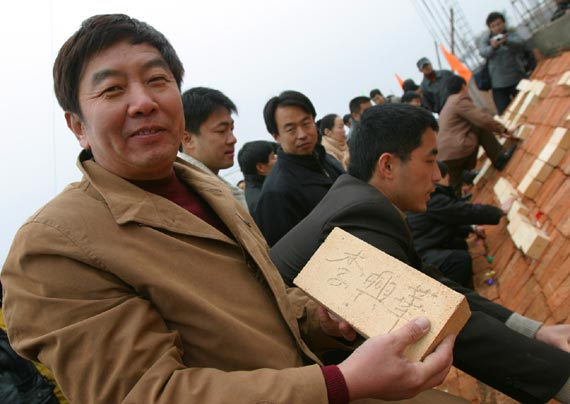 ↑黨代表們把刻有自己簽名的鋼磚拼出“開工大典”四個大字,表示要為學(xué)院建設(shè)添磚加瓦。