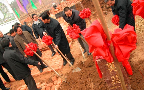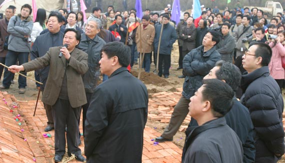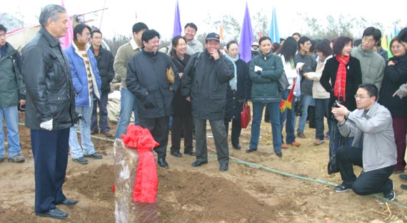 ↑來賓、領(lǐng)導(dǎo)為新校區(qū)奠基石培土。