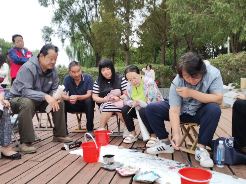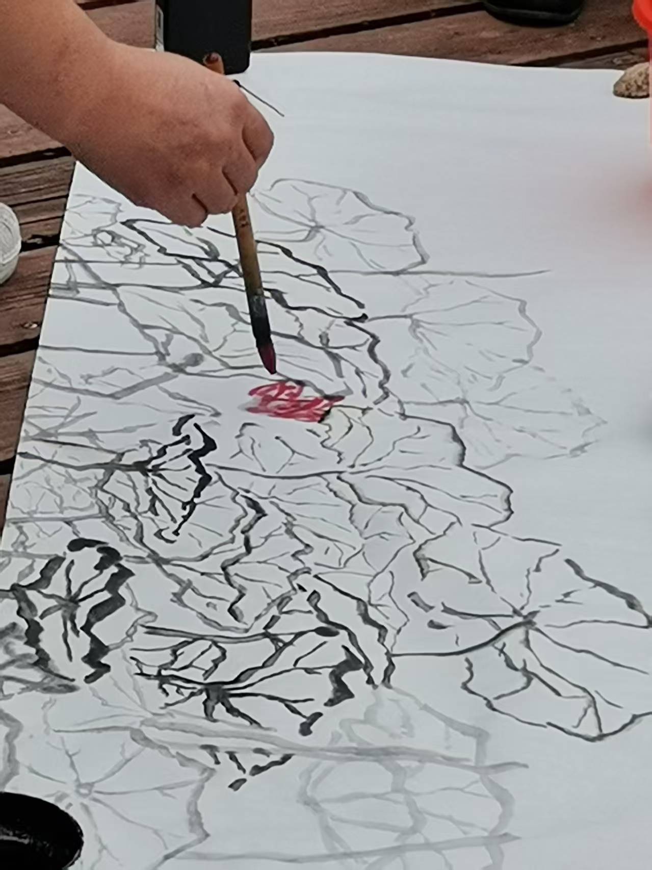 在肥城湖畔,伴著習習清風,造型藝術學院陳一云老師帶領居民置身于接天蓮葉、瀲滟湖光之中,開啟了一堂別開生面的中國畫戶外課堂。陳老師從基礎觀察入手,將中國畫中“留白”“寫意” 的高深理念,拆解成通俗易懂的操作方法。他手持毛筆,蘸墨、運筆間,一邊畫一邊講解:“這里要輕一點,像荷葉邊緣被風吹得卷起來的樣子;這里要濃一點,突出荷梗的挺拔。” 翻卷的荷葉、挺立的荷梗便在宣紙上自然流淌,生動傳神。一位參與課程的居民感慨道:“跟著老師看荷、畫荷,心一下子就靜下來了。這種專注與放松的狀態,比單純學會繪畫技法更珍貴。”