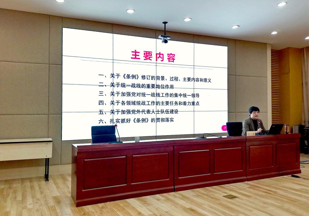 白文娟從《條例》修訂的背景、過程、主要內(nèi)容和意義,統(tǒng)一戰(zhàn)線的重要地位作用,加強(qiáng)黨對(duì)統(tǒng)一戰(zhàn)線工作的集中統(tǒng)一領(lǐng)導(dǎo),各領(lǐng)域統(tǒng)戰(zhàn)工作的主要任務(wù)和著力點(diǎn),加強(qiáng)黨外代表人士隊(duì)伍建設(shè),扎實(shí)抓好《條例》的貫徹落實(shí)六個(gè)方面對(duì)《條例》作出了詳細(xì)講解。