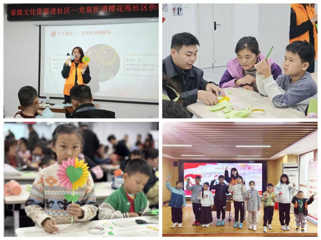 紅色基因,更在美育課堂中代代相傳。濟南社區里,數字藝術與傳媒學院張麗麗老師以少年英雄雨來的故事開篇,教孩子們折繪“消息樹”,“這棵樹不僅是手工,更是革命年代的‘通信兵’,代表著勇氣和智慧。”孩子們屏住呼吸,仔細壓好每一道折痕,當翠綠的“消息樹”在掌心成形,小臉上滿是自豪。百里之外的棗莊社區,數字藝術與傳媒學院的許鳳豪老師正帶領學生馮晨、馮馨瑤教孩子們制作和平鴿與英雄花,從革命先輩的事跡講到和平的珍貴。兩地課堂遙相呼應,紅色種子在孩子們心中悄然扎根。