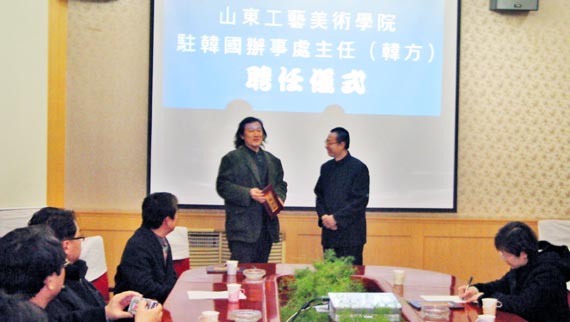 山東工藝美院辦公室王立果主任主持了簽字儀式。韓國大邱視覺藝術協會的其他客人及山東工藝美院李新副院長、教務處李友生處長、科研處胡希佳處長,裝潢系苗登宇主任、趙進副主任和各教研室主任及師生出席了聘任議式。