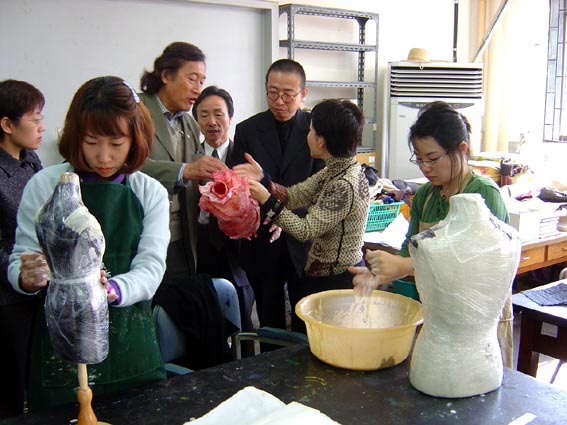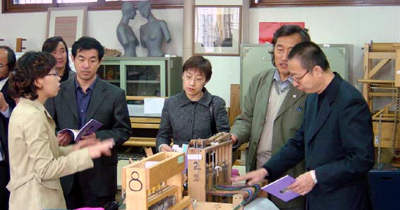 院長一行在藝術學院主任玄文哲教授的陪同下考察了該院的教授、講師辦公室和學生上課情況,與部分教授和教師進行了交流。藝術學院有工藝、東洋畫、西洋畫和設計四個系。其中,工藝有染織、陶瓷、實用產品設計等專業,設計有裝潢、舞臺藝術設計、環境設計和室內設計等專業。工藝系的教學比較有特色。一是一年級學生進行專業基礎理論學習,二、三、四年級進入實習教室或教授工作室,同時進行實踐操作,不同年級的學生可以互相交流,高年級的學生可以指導低年級學生。二是教學特別重視藝術與技能的結合,突出動手能力,各個專業都配備技能學習所需的設備,如材料課學生在簡單機床上了解不同材料的性能和藝術效果,編織課在小型織機上進行手工編織,染色課在小模特身上用小塊韓紙經某種天然液體浸泡后貼到模特身上,再涂上染料,待曬干后從后面剪開,就做成一件立體服裝,非常直觀。三是專業直接面向社會,特別是實用產品設計內容非常豐富,有產品開發、產品研究及產品設計與制作,不僅限于韓國,而且研究制作歐洲各國、美國、日本、中國等國家的實用產品,有木頭、金屬、線布等不同材質。另外,藝術學院及所考察的其他藝術院校一樣,教室都很大,走廊很寬,兩邊統一擺放供學生使用的壁櫥。這些經驗我院在新校區建設中都可借鑒。