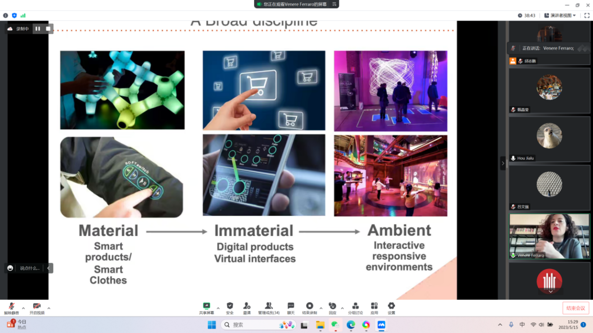 在研究生處和國際交流合作處的組織和協助下,5月15日下午,由美術館館長、產品系統設計工作室負責人、研究生導師林宇峰擔任主講的《產品交互行為設計與研究》課程邀請米蘭理工大學費拉羅·維納瑞(Venere Ferraro)教授為2021級工業設計、家居設計、展示設計專業碩士生講授“交互 ? 行為 ? 產品”專題講座。