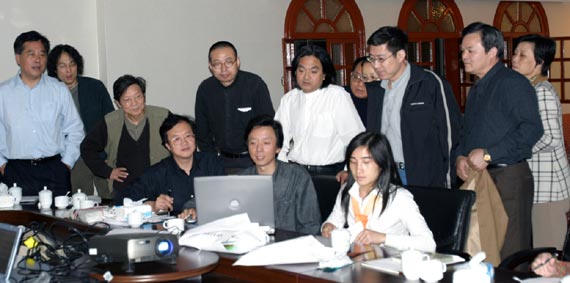 大展學術(shù)委員會委員在逐件評審作品。從左至右依次為:盧永毅、胡項城、許平、潘魯生、胡平