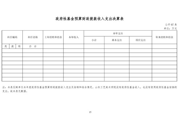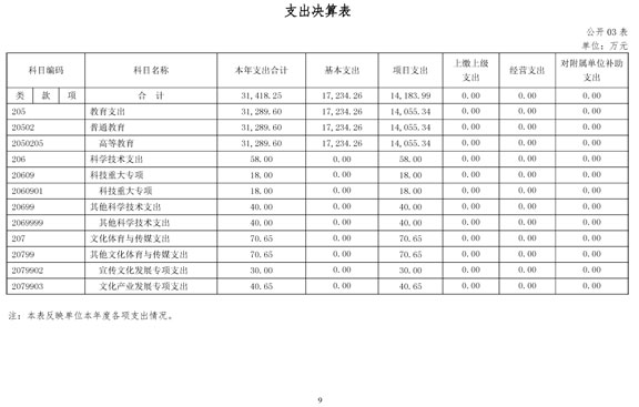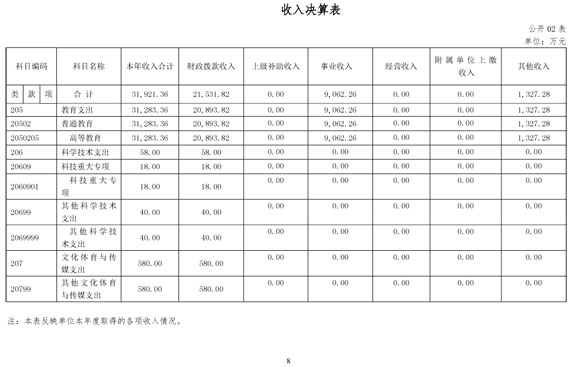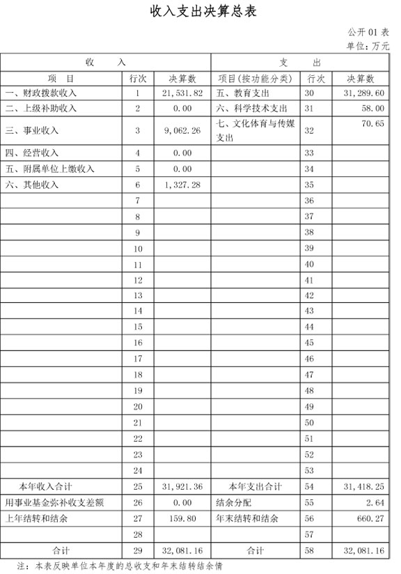 第三部分2015年決算情況和重要事項說明一、2015年決算情況說明(一)收入支出決算總體情況2015年收入總計32,081.16萬元(其中本年收入31,921.36萬元),包括:財政撥款收入 21,531.82 萬元,2015年初結轉和結余159.80萬元。2015年支出總計 32,081.16 萬元(其中本年支出 31,418.25 萬元),包括:教育支出31,289.60萬元,科學技術支出58.00萬元,文化體育與傳媒支出70.65萬元,結余分配2.64萬元,年末結轉和結余660.27萬元。(二)財政撥款收入支出決算總體情況2015年財政撥款收入決算總計21,691.62萬元,收入全部為一般公共預算財政撥款,無政府性基金預算財政撥款收入,包括一般公共預算財政撥款本年收入21,531.82萬元、年初結轉和結余159.80萬元。2015年財政撥款支出決算總計21,691.62萬元,支出具體情況如下:1、教育支出20,902.70萬元,主要用于人員經費、公用經費、設備購置、大型修繕、化解債務等方面。2、科學技術支出58.00萬元,主要用于科技重大專項和應用技術研發資金、泰山學者工程建設專項經費。3、文化體育與傳媒支出70.65萬元,主要用于公共文化服務體系建設資金-宣傳文化發展、服務業發展專項資金-文化產業發展。4、年末結轉和結余660.27萬元,主要是2015年中央財政支持地方高校發展專項資金、教育獎補資金、服務業發展專項資金-文化產業發展。(三)一般公共預算財政撥款支出決算情況2015年一般公共預算財政撥款支出21,031.35萬元,比年初預算數增加9,042.35 萬元,主要原因是教育支出、科學技術支出、文化體育與傳媒支出均比年初預算有所增加。支出具體情況如下:1、教育支出20,902.70萬元,主要用于人員經費、公用經費、設備購置、大型修繕、化解債務等方面, 比年初預算數增加8,913.70 萬元,主要原因是年中追加了項目資金,主要包括區域戰略發展:省發改委兩區主題展館建設專項資金、2015年中央財政支持地方高校發展專項資金、服務業發展專項資金-文化產業發展、教育獎補資金等。2、科學技術支出58.00萬元,主要用于科研項目支出, 比年初預算數增加58萬元,主要原因是年中追加了兩筆項目資金,主要包括科技重大專項和應用技術研發資金、泰山學者工程建設專項經費。3、文化體育與傳媒支出70.65萬元,主要用于宣傳文化發展和文化產業發展方面支出, 比年初預算數增加70.65萬元,主要原因是年中追加了兩筆項目資金,包括公共文化服務體系建設資金-宣傳文化發展、服務業發展專項資金-文化產業發展。(四)一般公共預算財政撥款基本支出決算情況2015年一般公共預算財政撥款基本支出決算 11,479.51萬元,包括人員經費和公用經費,支出具體情況如下:人員經費9,190.50萬元,主要包括:基本工資、津貼補貼、社會保障繳費、績效工資、離休費、退休費、生活補助、獎勵金、住房公積金、購房補貼、其他對個人和家庭的補助支出等。公用經費2,289.01萬元,主要包括:辦公費、水費、電費、郵電費、取暖費、差旅費、勞務費、其他交通費用、其他商品和服務支出。二、重要事項說明(一)政府采購支出情況說明2015年本部門政府采購金額2,959.98萬元,其中:政府采購貨物金額1,525.07萬元、政府采購工程金額636.48 萬元、政府采購服務金額 798.43 萬元。授予中小企業合同金額2,006.22萬元,占政府采購總額的67.78% ,其中:授予小微企業合同金額 1,136.54萬元,占政府采購總額的38.39%。(二)國有資產占用情況說明。截至2015年12月31日,本部門共有車輛 15 輛,其中,公務用車 15 輛、一般執法執勤用車 0 輛、特種專業技術用車 0 輛、其他用車0 輛;單位價值200萬元以上大型設備 0 臺(套)。