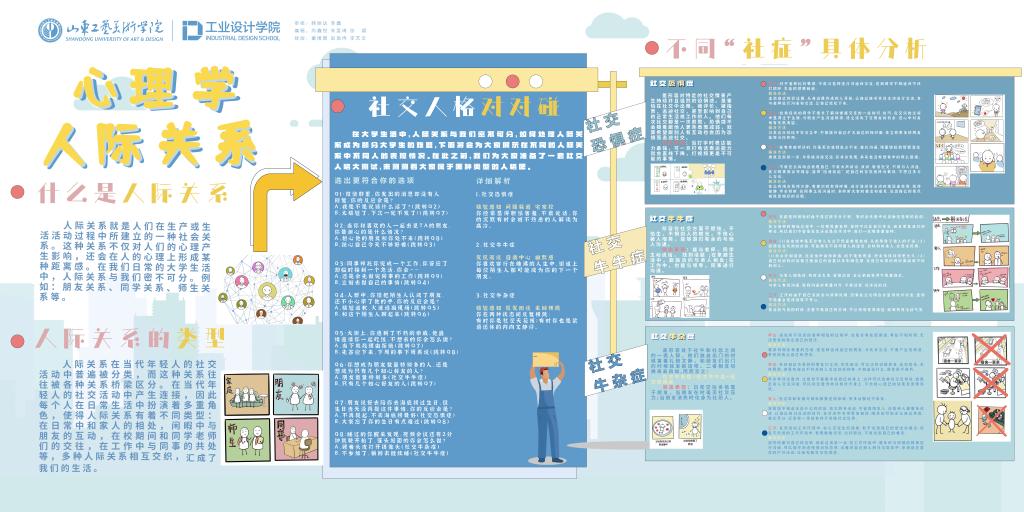 我院心理健康展板以“人際關系”為主題,解釋了人際關系的定義以及學生中常見的幾種人際關系類型;基于每個人是獨特的個體,有不同的性格特點,在人際關系上有不用的處理方式,因此展板在設計上增加了社交人格的趣味測試,以此“對癥下藥”。同時,學生在文字基礎上,動手繪制了與文字對應的簡筆漫畫,以提高觀看者的閱讀興趣,達到緩解當代大學生在人際交往方面的焦慮,用科學辦法處理人際關系問題的初衷。