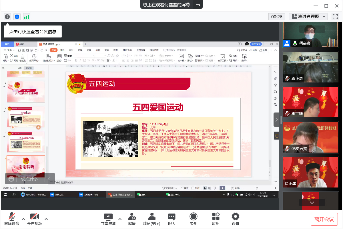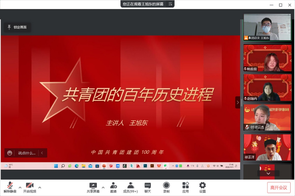 回望百年,青春向黨。2022年是中國(guó)共產(chǎn)主義青年團(tuán)建團(tuán)一百周年,校團(tuán)委號(hào)召,要教育引導(dǎo)同學(xué)們樹(shù)立正確的理想信念和價(jià)值取向,高舉團(tuán)旗跟黨走,進(jìn)一步明確當(dāng)代青年的責(zé)任與使命。4月11日,工業(yè)設(shè)計(jì)學(xué)院團(tuán)總支組織青年團(tuán)員開(kāi)展“砥礪奮進(jìn)守初心 青春獻(xiàn)禮二十大”線上主題團(tuán)課。