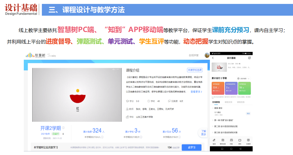 《設計基礎》為線上線下混合通識課程,6學分,96學時。該課程包括線上理論講授、課下調研與實踐、課堂互動三大教學模塊。線上教學主要依托智慧樹PC端、“知到”APP移動端等教學平臺,保證學生課前充分預習,課內自主學習;并利用線上平臺的進度督導、彈題測試、單元測試、學生互評等功能,動態把握學生對知識點的掌握。線下見面課主要依托教室,完成互動答疑、實踐作業匯報與作業點評等環節;也在博物館、美術館、藝術中心等開展現場教學。通過多層次、立體化的課程教學,使學生真正做到聽得進、學得會、記得牢、勤思考,完成從知識學習、到實踐訓練,再到能力內化的學習過程。