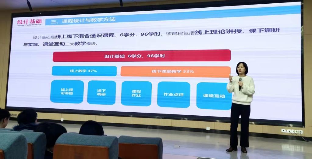 我院教師王君秋分別從設計基礎的歷史發展階段、教學目標、教學重難點、課程創新點、課程建設、教學效果以及課程展望幾個方面介紹了《設計基礎》課程。該課程是產品設計專業所開設的抽象審美訓練專業基礎課程,將專業的審美認知特點與平面構成、色彩構成、立體構成、形態設計等抽象審美訓練方法相結合,使學生掌握以設計視角觀察審美客體、抽象審美語言,構建審美形式的方法。為后續設計課程提供了必要的抽象審美分析能力與創造能力。