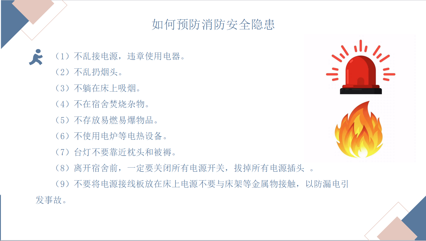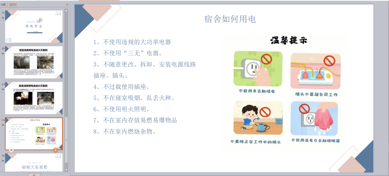 班會由學(xué)院統(tǒng)一制作安全主題教育課件,各班班委組織學(xué)生開展,講解相關(guān)安全知識。班會內(nèi)容涵蓋了火災(zāi)預(yù)防、交通安全、人身安全、宿舍安全等方面,旨在幫助學(xué)生了解各種安全風(fēng)險(xiǎn),掌握應(yīng)對策略,從而引導(dǎo)廣大同學(xué),提高安全意識,增強(qiáng)安全防范能力,切實(shí)保障學(xué)生的人身和財(cái)產(chǎn)安全。