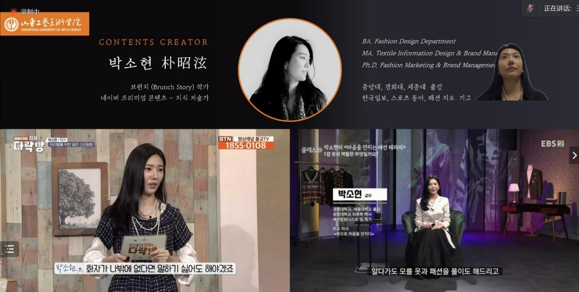 課程主講人樸昭泫,畢業(yè)于韓國(guó)中央大學(xué)時(shí)尚營(yíng)銷與品牌管理專業(yè)博士學(xué)位,曾任DeaHwa Image Company公司代表及設(shè)計(jì)總監(jiān)、Min Jung Company公司代表、韓國(guó)世宗大學(xué)客座講師,現(xiàn)任韓國(guó)慶熙大學(xué)服裝設(shè)計(jì)專業(yè)教授。