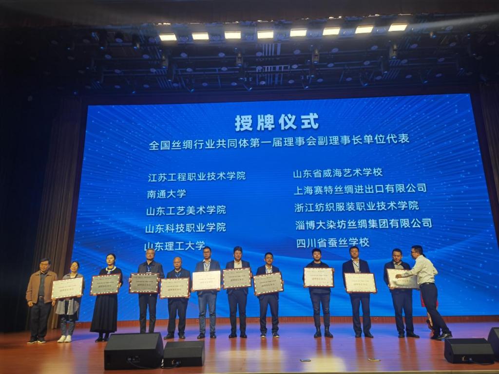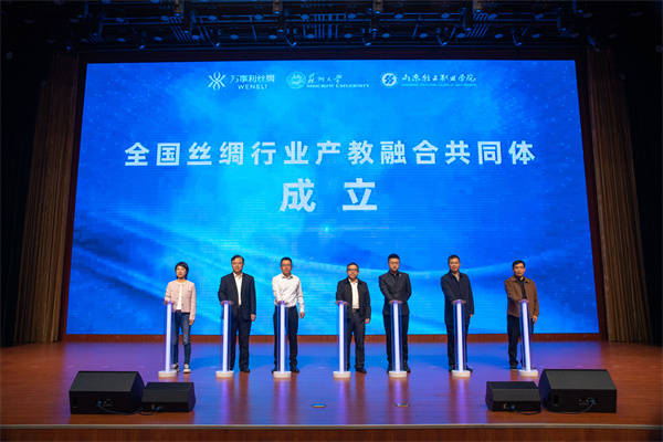 全國絲綢行業產教融合共同體由萬事利集團有限公司、蘇州大學、山東輕工職業學院共同牽頭成立。山東輕工職業學院黨委副書記、校長袁雷主持成立大會。會上,表決通過了共同體第一屆理事會理事長單位、副理事長單位、理事單位、《全國絲綢行業產教融合共同體章程》,發布需求清單,并為理事長單位、副理事長單位代表授牌,其他相關部門及共同體成員單位參加了會議。