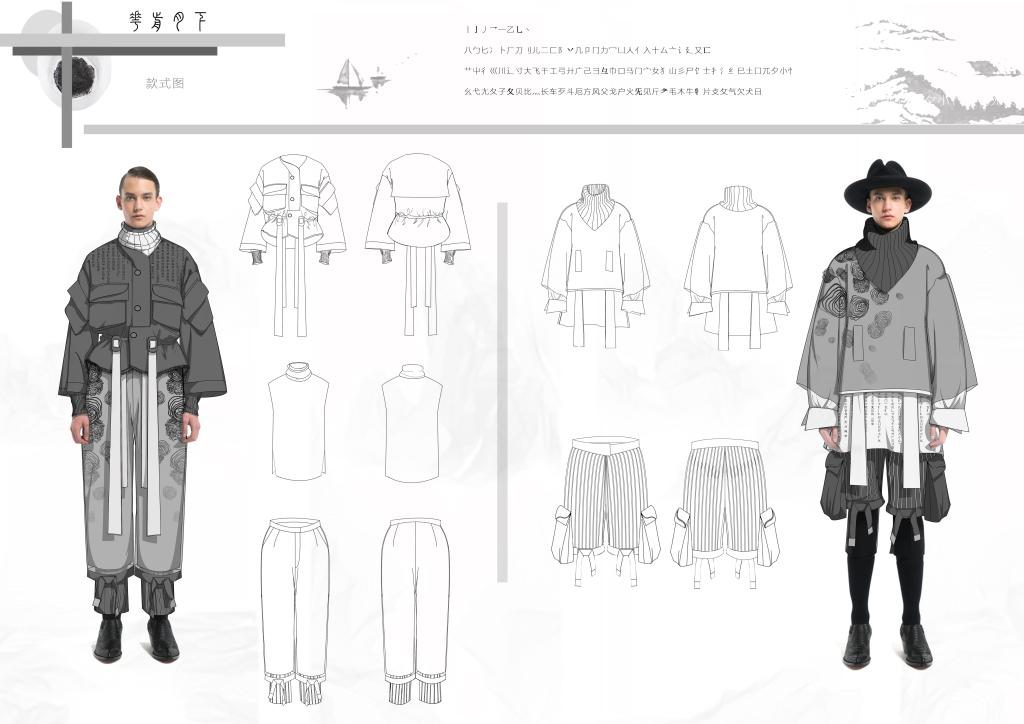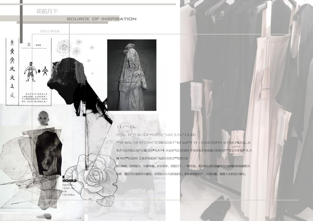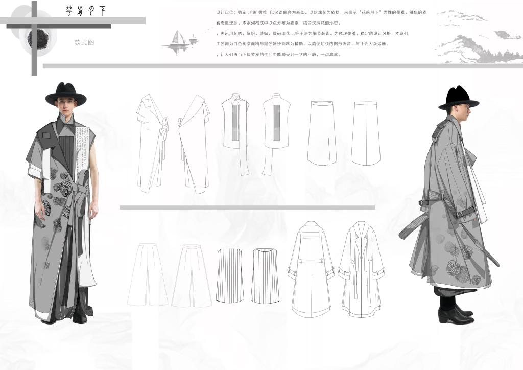 設計說明:穩定形象儒雅 以漢語偏旁為基礎。以玫瑰花為依據,來展示“花前月下”男性的儒雅,融焦的衣著態度理念。本系列構成中以點分布為要素,結合玫瑰花的形態,再運用刺繡,編織,縫貼...等手法為細節裝飾。為體現儒雅,穩定的設計風格,本系主色調為真絲綃面料與黑色歐根紗面料為輔助,以簡便明快的圖形語音,與社會大眾溝通,讓人們再當下快節奏的生活中能感受到一絲的平靜,一點悠然。