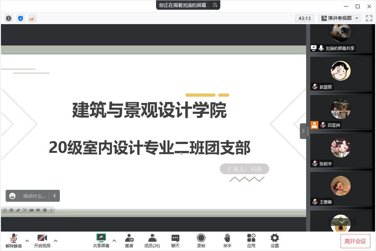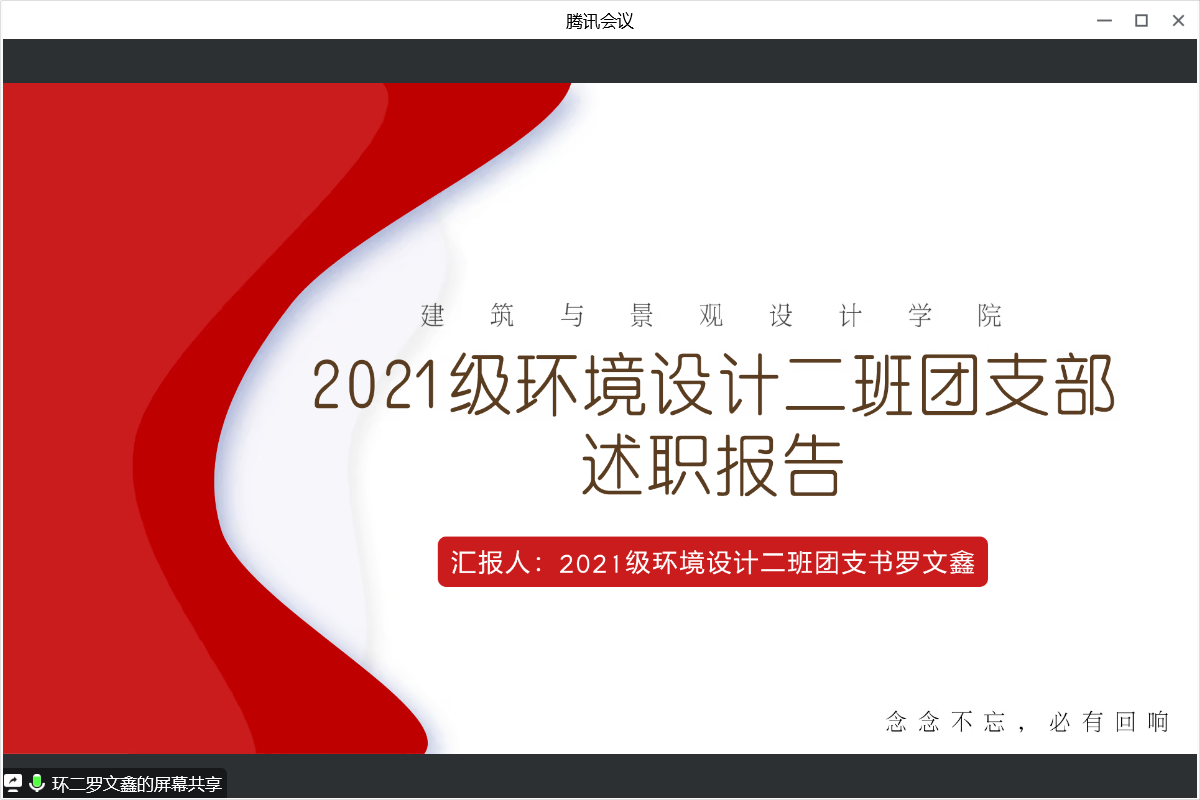 為持續推動基層團組織規范化建設,檢驗團支部工作成效,按照團委基層團支部述職工作安排,建筑與景觀設計學院團總支于12月8日開展線上團支書述職大會,本次會議由團總支書記陳鐵主持,各年級輔導員、團總支委員及各班團支部書記參加。