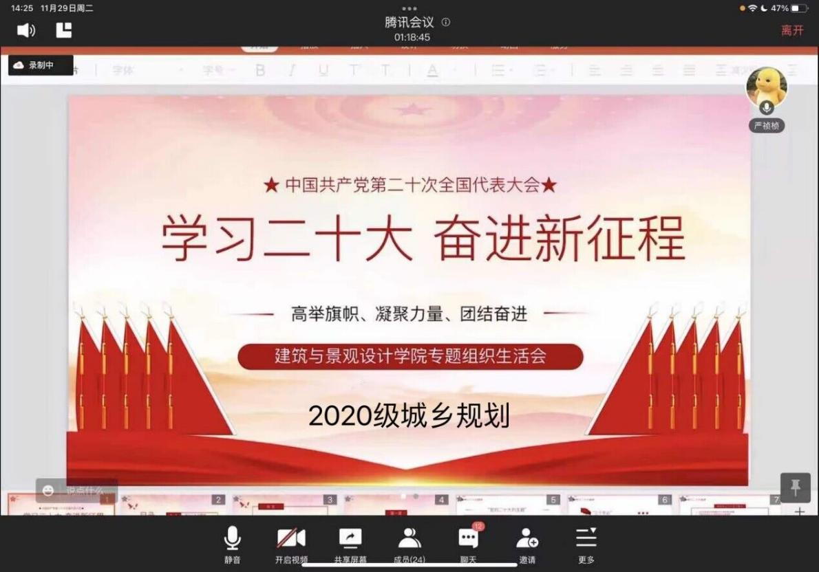 為深入學習宣傳貫徹黨的二十大精神,用黨的科學理論武裝青年,用黨的初心使命感召青年,建筑與景觀設計學院團總支于11月30日線上開展“學習二十大、永遠跟黨走、奮進新征程”專題組織生活會,會議由各班團支書主持,全體團員參加。