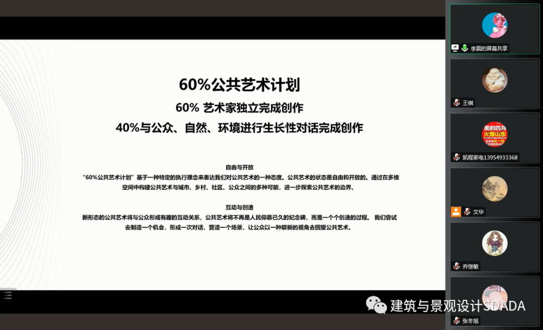 為積極推進我院課程改革與專業(yè)建設工作,拓寬師生們的學術視野,2022年9月18日上午,由建筑與景觀設計學院邀請,中央美術學院中國公共藝術研究中心項目主任李震教授通過騰訊會議為我院師生帶來了名為《中央美術學院-公共藝術與空間設計工作室的教學與實踐》線上學術講座。本次講座由教務處和建筑與景觀設計學院主辦,是學校博雅論壇系列活動之一,也是建筑與景觀設計學院“藝+建”論壇系列學術活動之一。講座由建筑與景觀設計學院院長李文華教授主持,近200人參加活動。參會人員除本院教師和部分學生外,還有來自兄弟院校的相關專家學者。