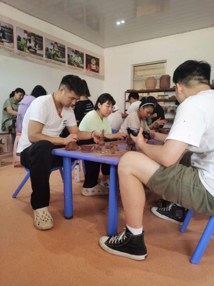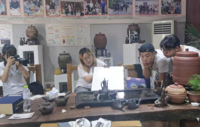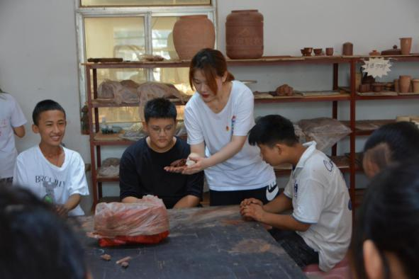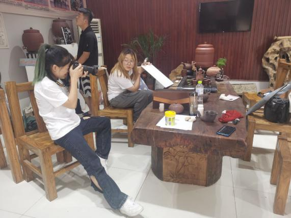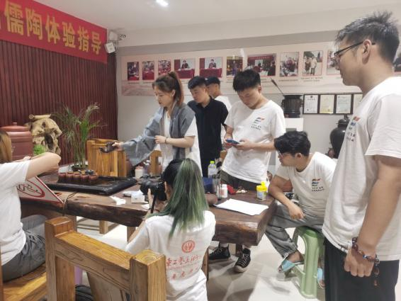 為更好地發(fā)現(xiàn)問題、解決問題,更具有針對(duì)性的幫扶企業(yè)“走出去”,實(shí)踐團(tuán)成員在公司設(shè)計(jì)師呂老師的指導(dǎo)下,走進(jìn)儒陶的生產(chǎn)線中。呂老師帶領(lǐng)團(tuán)隊(duì)成員從原材料的選擇到出售都進(jìn)行了詳細(xì)的講解,非遺傳承人馬修賽老師帶領(lǐng)團(tuán)隊(duì)成員親身體驗(yàn)儒陶工藝的制作流程。手指的觸感能感受到陶土的質(zhì)樸,燒制成型的陶器會(huì)讓人切實(shí)感受到浴火重生真實(shí)內(nèi)涵。