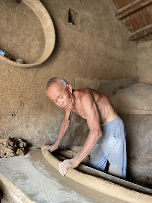 之后,團(tuán)隊(duì)來到柘溝鎮(zhèn)山東儒陶工藝制品有限公司,實(shí)踐調(diào)研了魯柘硯傳統(tǒng)工藝在企業(yè)文化輸出中的創(chuàng)新發(fā)展,企業(yè)負(fù)責(zé)人帶我們參觀學(xué)習(xí)了魯柘硯的生產(chǎn)流水線,拜訪了當(dāng)?shù)赜忻睦鱾鞒写髱焺㈧o杰老先生,通過與劉靜杰老先生的交流得知,他是家族里柘溝大缸的第五代傳人,至今都堅(jiān)持拉坯燒窯。