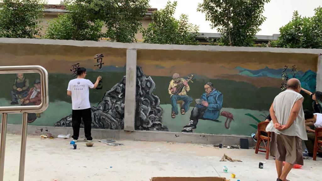 據實地考察調研,山東省濟寧市泗水縣常年在外務工人員14萬余人,占全縣總人口的22%,留下了大量年邁老人留守家鄉,他們經濟收入低,生活質量差,安全隱患多。在此背景下,中冊鎮敬老院由當地政府牽頭、依托基層黨組織建立而成。為進一步弘揚敬老、愛老、尊老的傳統美德,在團縣委的大力支持下,社會實踐團隊在中冊鎮敬老院外墻進行宣傳畫創作與繪制。