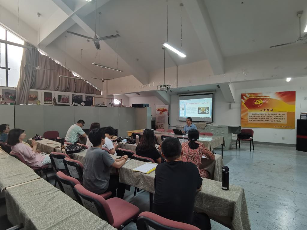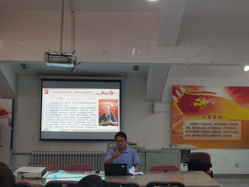 2021年6月25日,現代手工藝術學院黨總支書記金偉在B444多媒體教室為學院黨員教師講授《對黨忠誠》黨史學習教育專題黨課。
