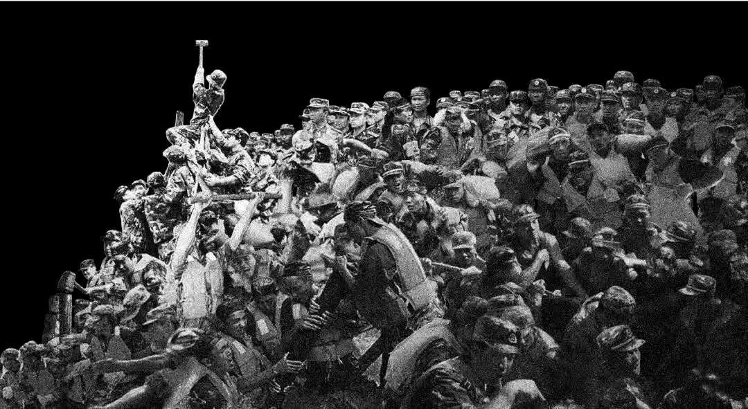 畫面由近200多位抗洪戰士在抗洪搶險第一線的戰斗場面組成了山脈的形狀,象征著抗洪戰士用自己的身體構成了猶如大山一般的銅墻鐵壁,與洪水抗爭力量如山。畫面左上角的軍人用盡全力舉起的大錘如燈塔一般照亮了周圍,表達了抗洪精神鼓舞著所有人的創作理念。