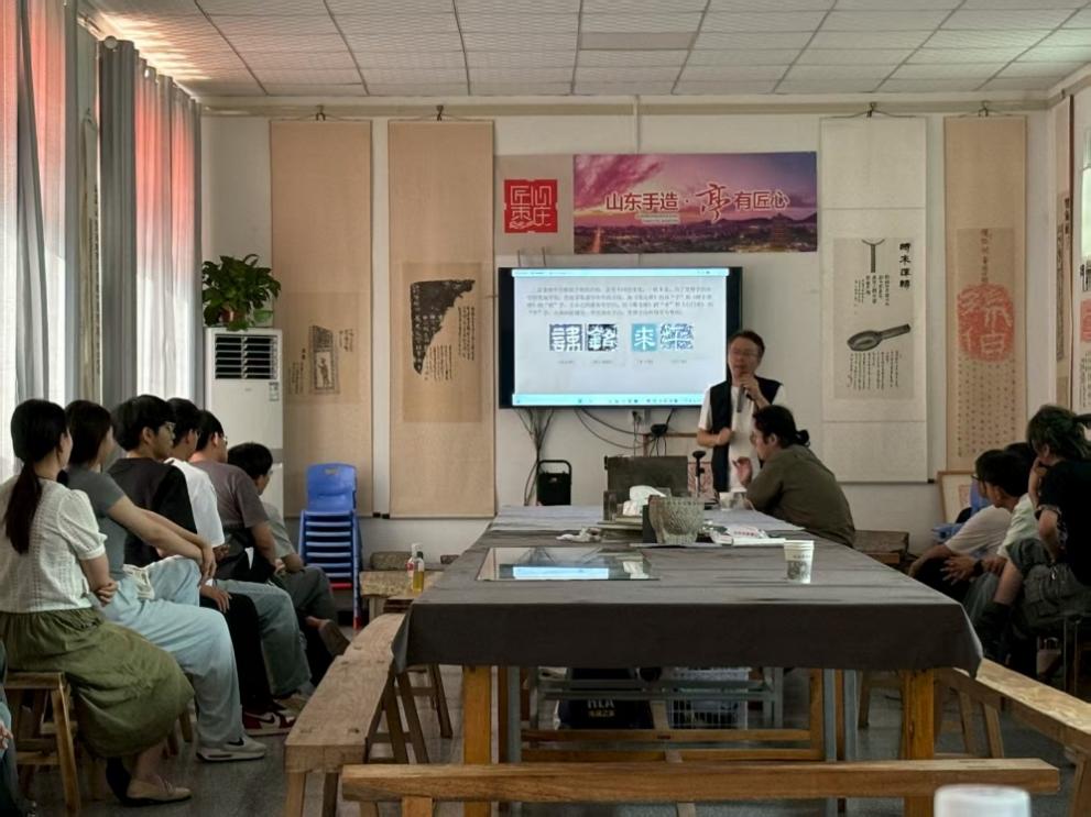 魯西南地處中原與齊魯文化交匯帶,中古時期碑刻遺存豐富。這些碑石或記史述事,是地域文明的鮮活注腳。本次實踐活動通過調研山東運河中古碑刻,賦能激活中華優秀傳統文化,通過講座、展覽等形式,把優質文化資源送到人民群眾身邊。團隊走進棗莊明佑博物館。跟隨王燦館長學習并參觀了多個著名的經典的碑刻和拓片,中古碑刻與拓片的陳列如展開一部立體的“金石史書”。團隊成員逐幀記錄碑刻的風化斑駁、文字殘缺,這些館藏珍品,不僅是書法演變的活化石,更以“微縮樣本”姿態,為后續田野調查中辨識散存碑刻的時代特征、解讀地域文化基因,筑牢了實證根基 。