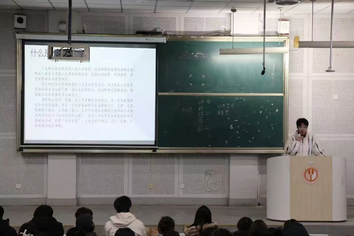 團課開始,於永卓首先闡述了社會實踐的含義、意義及重要性與必要性,強調方法論與實踐相結合,并鼓勵新生積極參與志愿服務活動。隨后楊澤軒介紹了社會實踐內容,類型與開展方式,引導同學們依據專業興趣選擇實踐方向。最后李翊綺以學院往年暑期實踐情況為例,介紹實踐過程與成果,讓新生直觀了解步驟,鼓舞同學們勇于發散創新思維,于實踐中奉獻青春,于奮斗中書寫自我。