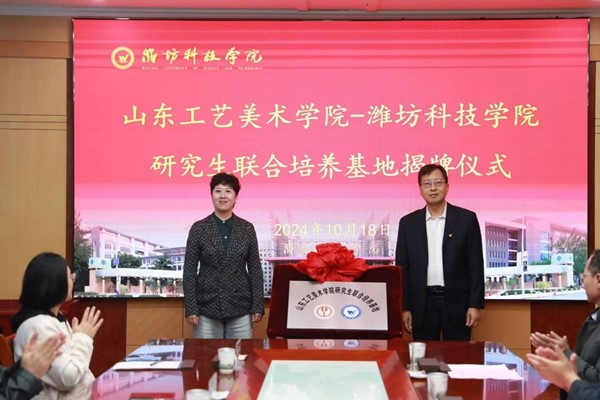 數字藝術與傳媒學院院長吳向陽與濰坊科技學院藝術學院院長姜亦金簽署研究生聯合培養基地協議,研究生處處長趙屹與濰坊科技學院校長、黨委副書記魏華中為研究生聯合培養基地揭牌。