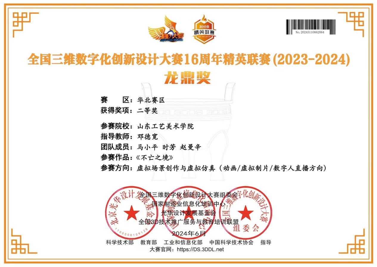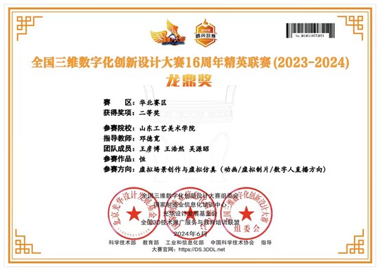 2024年7月,在“全國3D大賽16周年精英聯(lián)賽(2023-2024)”虛擬場景創(chuàng)作與虛擬仿真專項(xiàng)賽中,數(shù)字藝術(shù)與傳媒學(xué)院21級戲劇影視美術(shù)設(shè)計(jì)專業(yè)的四組學(xué)生作品在大賽中脫穎而出,榮獲華北賽區(qū)二等獎(jiǎng)三位,三等獎(jiǎng)一位,鄧德寬老師榮獲優(yōu)秀指導(dǎo)教師。