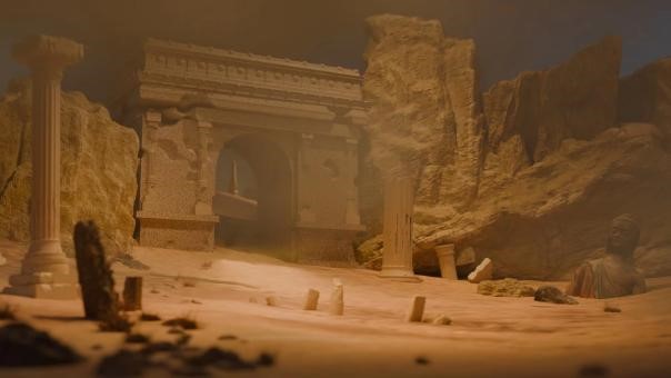 畫面內(nèi)建筑的靈感來源來自于奧利爾斯坦因所著的《西域考古記》和《在中亞的古道上》等書籍資料,從中我們了解到樓蘭是一個(gè)融合了東西方文化元素的國家。因此,我們選取了古印度時(shí)期的佛塔形制、類似漢長城的城墻、古羅馬時(shí)期的城門和柱式,以及漢代出土的佛像等元素融入畫面設(shè)計(jì)中。
