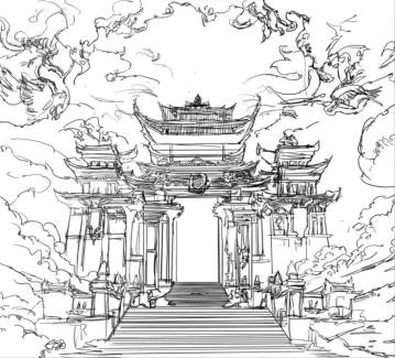 《恒》是一個(gè)基于中國古代神話仙界以及漢代升仙思想的三維場景建模作品。我們參考了巫鴻老師的著作《黃泉下的美術(shù)》中對升仙的描繪對場景進(jìn)行了想象,仿照漢代未央宮規(guī)模宏大的特點(diǎn),追求靈動(dòng)、躍騰、升華的空間效果,視覺上加入大量云朵、霧氣的元素,讓人仿佛身處金碧輝煌的仙境。氣氛圖使用生成式AI工具Midjourney通過提供關(guān)鍵提示詞與概念設(shè)計(jì)圖組合以圖生圖與文生圖并行的形式進(jìn)行場景氣氛圖繪制,加入了粒子特效以及體積云模組以烘托神秘、夢幻的視覺特點(diǎn)。漢代天界升仙場景模型展現(xiàn)了古人對天界的想象,引導(dǎo)觀眾思考人與自然、宇宙的關(guān)系,以及漢代哲學(xué)思想中的“天人合一”和對生命意義的探索。