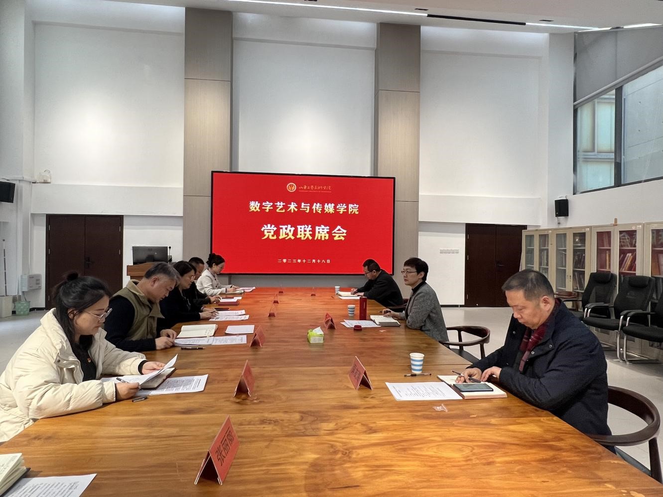 會上,數字藝術與傳媒學院黨總支書記李清華、院長吳向陽分別主持召開了學院黨總支會議和黨政聯席會議。會議嚴格落實“第一議題”制度,集中學習了習近平總書記在中央經濟工作會議上的重要講話精神,黨總支對2023下半年新接收預備黨員進行了審查,聽取了發展對象入黨流程及政審情況的匯報。黨政聯席會研究了推進學院2023屆畢業生和2024屆畢業生就業工作相關事宜。