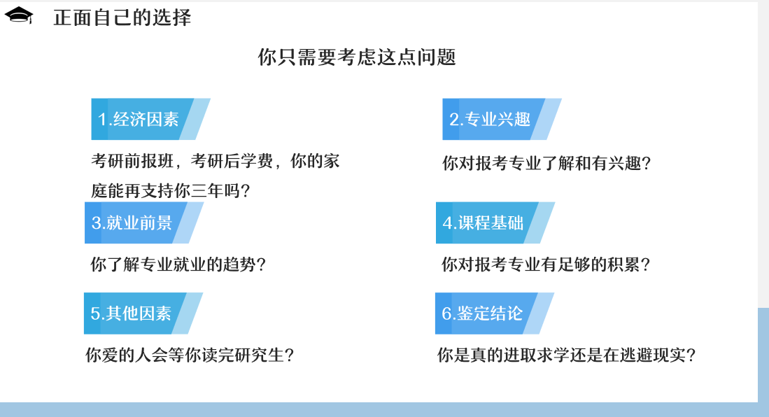 劉子昂結(jié)合過往三年的學(xué)習(xí)經(jīng)歷和心得告訴大家:“最大的錯(cuò)誤就是當(dāng)你在糾結(jié)的時(shí)候,你以為你是在為你的前途操心,實(shí)際上糾結(jié)的唯一意義是在浪費(fèi)時(shí)間,不管大學(xué)之后要做什么,平時(shí)的專業(yè)學(xué)習(xí)是一天都不能落下的,如果你對考研沒興趣,覺得考研英語就是學(xué)不下去,在自身專業(yè)能力過硬的前提下不如勇敢地去就業(yè),內(nèi)心有明確的就業(yè)目標(biāo)那就朝著自己的職業(yè)理想和藝術(shù)追求奮斗前進(jìn),如果你暫時(shí)沒有明確目標(biāo)和規(guī)劃,對專業(yè)和未來感到有一絲迷茫,那考研考編或許對你來說是個(gè)更好的出路。”