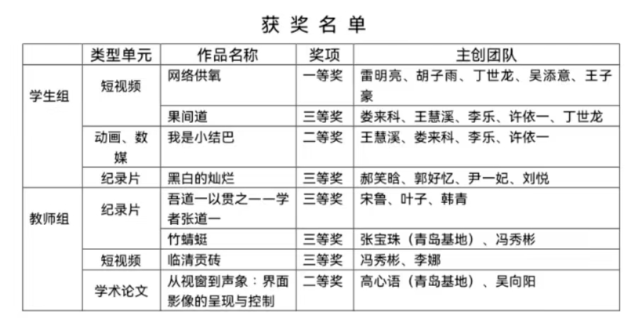 2021-2022年度第十二屆“學(xué)院獎(jiǎng)”影視作品推優(yōu)活動(dòng)共收到有效參賽作品2075份,其中教師組作品238部、學(xué)生組1837部。數(shù)字藝術(shù)與傳媒學(xué)院在本次推優(yōu)活動(dòng)中獲得“學(xué)院獎(jiǎng)”7項(xiàng)。其中教師組獲獎(jiǎng)作品3部(紀(jì)錄片單元2部、短視頻單元1部),學(xué)生組獲獎(jiǎng)作品4部(短視頻單元2部,動(dòng)畫、數(shù)字媒體單元1部,紀(jì)錄片單元1部)。