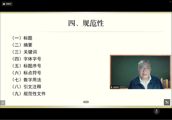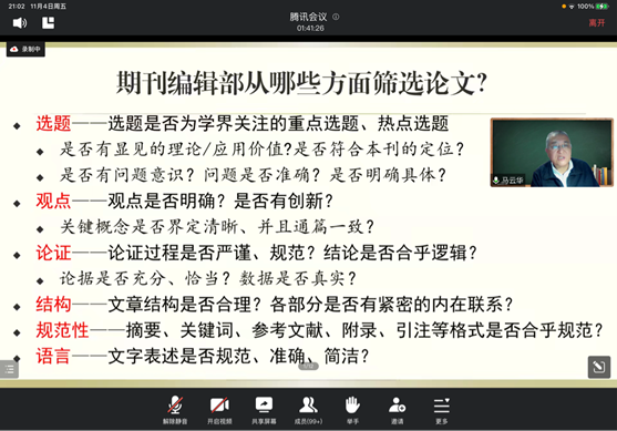 馬云華主編向老師同學們傾囊相授,講述了學術成果的規范化表達,從編輯部的角度談學術文章的寫作,提出如何學術文章選題聚焦的問題與研究對象的明確性,以清晰的分析問題思路,指出新的研究方法和論證方法。通過列舉多篇《民族藝術研究》期刊上的刊發的優質學術論文,指出學術論文寫作的規范性、理論性與凝練性,也提示了論文寫作過程中要規避的技術風險,其中主要囊括學術質量自評、寫作質量自評、風險自評、亮點自評以及針對目標期刊要求的適應性評估。在講座的最后,主講嘉賓與老師同學們進行了交流互動,對大家的疑問一一進行了詳細解答。