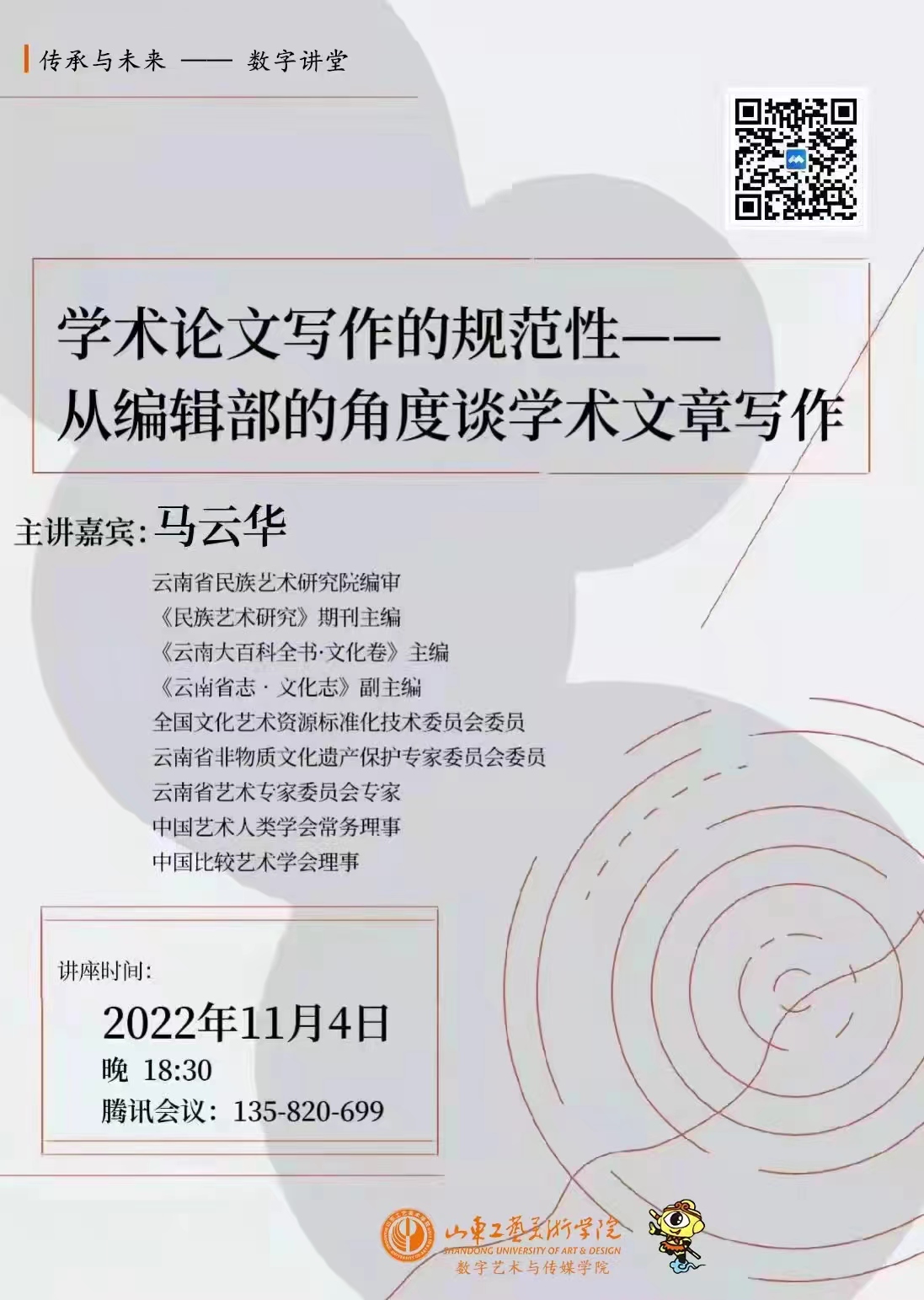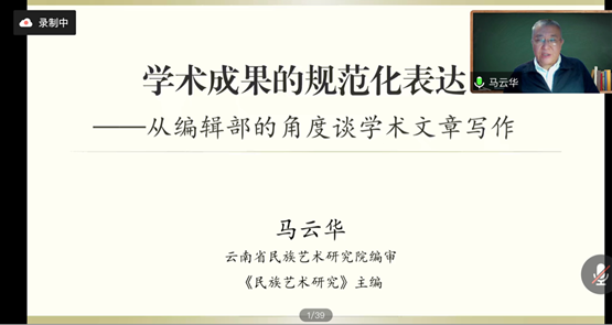 2022年11月4日晚18點30分至22點,數字藝術與傳媒學院舉辦了《學術論文寫作的規范性——從編輯部的角度談學術文章寫作》主題學術講座,此次講座由云南省民族藝術研究院編審、《民族藝術研究》期刊主編、全國文化藝術資源標準化技術委員會委員、云南省非物質文化遺產保護專家委員會委員、云南省藝術專家委員會專家、中國藝術人類學學會常務理事馬云華講授。