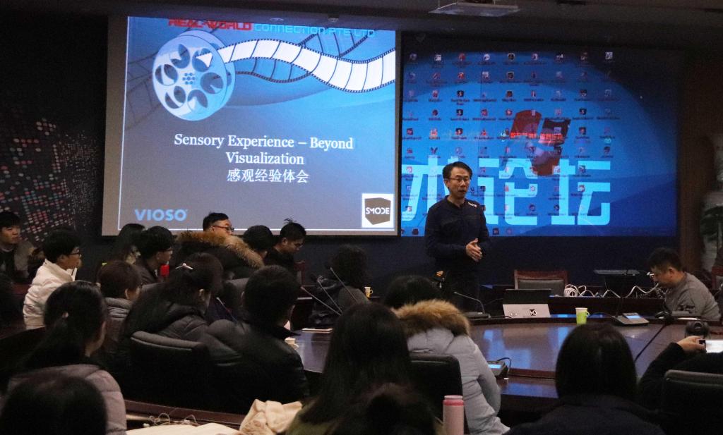 講座于上午9點(diǎn)開(kāi)始,宋文彬先以《數(shù)字工程的現(xiàn)在與未來(lái)》為主題,進(jìn)行了數(shù)字工程的相關(guān)介紹,他介紹了時(shí)下在數(shù)字影像的工程領(lǐng)域最為先進(jìn)和前沿的影像制作解決方案和工業(yè)成像方案,例如多媒體沙盤(pán),動(dòng)作捕捉、AR/VR、沉浸式空間體驗(yàn)、3D Mapping等工業(yè)影像領(lǐng)域最尖端商用解決途徑。這些行業(yè)先進(jìn)影像技術(shù)的演示,吸引了學(xué)生們的興趣,也極大的鼓舞了相關(guān)專(zhuān)業(yè)學(xué)生學(xué)習(xí)專(zhuān)業(yè)的熱情。宋文彬還介紹了這些解決方案的幕后功臣圖形渲染軟件smode和多維投影軟件vioso,他表示在數(shù)字影像工業(yè)領(lǐng)域面臨著人才短缺的現(xiàn)狀,希望相關(guān)專(zhuān)業(yè)的學(xué)生可以盡快找準(zhǔn)市場(chǎng)定位,快速切入到這個(gè)藍(lán)海市場(chǎng)中來(lái)。