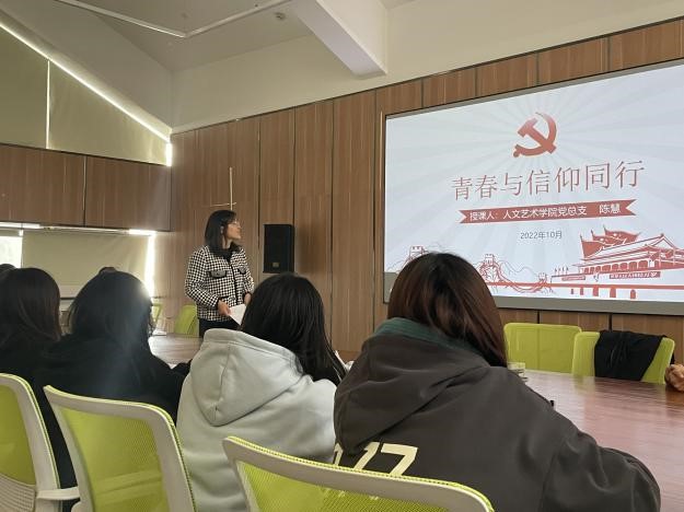 心中有信,方能致遠。青年理想遠大、信念堅定,是一個國家、一個民族無堅不摧的前進動力。青年志存高遠,就能激發奮進潛力。為了堅定學生的信仰、信念、信心,人文藝術學院黨總支書記陳慧、黨總支副書記蔡青春為新生開展“讓青春與信仰同行”主題黨課,黨課圍繞“讓信仰點亮人生”、“用奮斗譜寫青春”、“青春與信仰同行”三個方面,引導新生學習習近平新時代中國特色社會主義思想,堅定理想信念,始終做信仰堅定的青年馬克思主義者、做心懷遠大理想的新時代青年、做熱愛祖國的社會主義接班人。同時,引導新生主動承擔起時代賦予的使命、培養奮斗精神、努力掌握更多文化知識和專業技能,以真才實學服務人民,做到真學、真悟、真做,把永遠跟黨走作為永恒的初心,把偉大復興的中國夢作為青春的生動實踐。