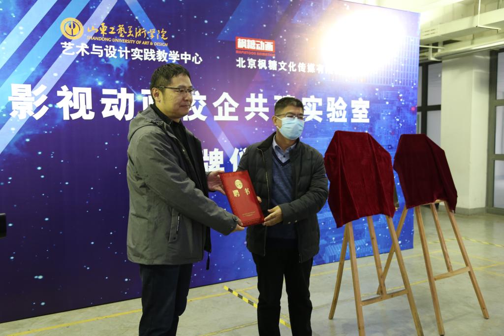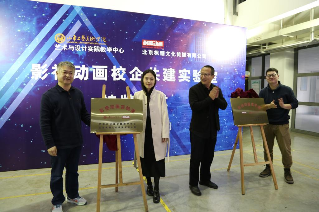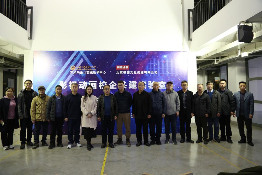 隨后,實踐教學中心副主任王傳廣為數字藝術與傳媒學院教師艾琳頒發校企共建影視動畫實驗室管理負責人聘書。李利劍、黃欣婷、顧群業、吳向陽共同為校企共建影視動畫實驗室揭牌。揭牌儀式結束后,與會人員集體合影。
