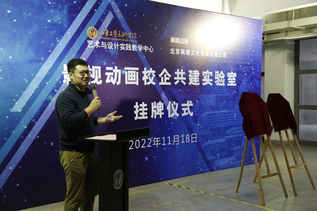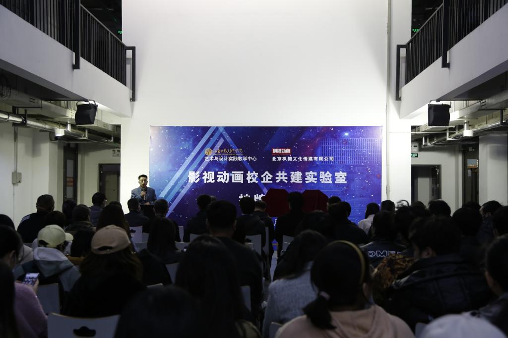 儀式上,高振堂介紹了校企共建影視動畫實驗室的基本情況。校企共建實驗室,是藝術與設計實踐教學中心為各二級學院搭建的實踐教學平臺,以解決二級學院在實踐教學過程中存在的技術難題及技術需求,注重教學成果的產出與轉化。實踐教學中心把技術型企業引入學校實驗室與二級學院“聯姻”,發揮校企各自的優勢,形成技術與人才的互補,共同培育人才,使學校、企業和學生的三方收益。