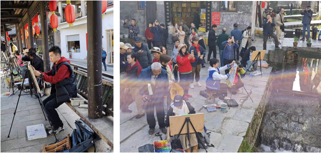 面對(duì)古樸的徽派建筑,迷人的小橋流水,同學(xué)們時(shí)而抬頭眺望,時(shí)而低頭沉思,時(shí)而駐筆停滯眉頭緊蹙,時(shí)而運(yùn)筆如飛自信滿滿,專注而又認(rèn)真的學(xué)生成為老師和游客眼中最美麗的風(fēng)景。隨著時(shí)間的流逝,一幅幅生動(dòng)而又形象的畫作不斷呈現(xiàn)。