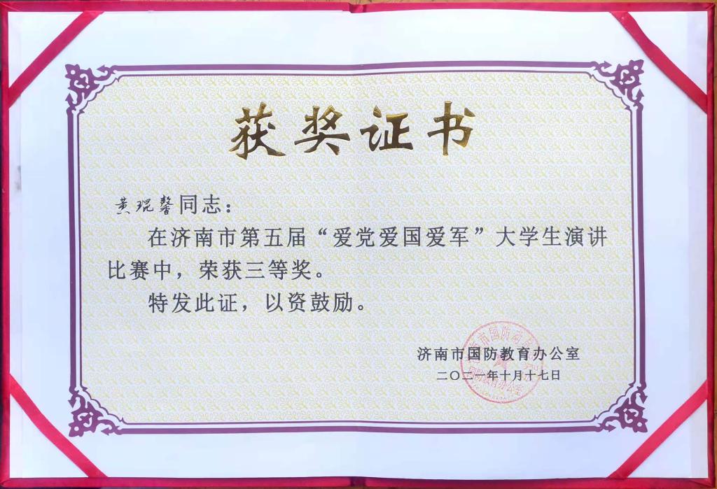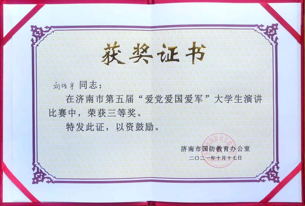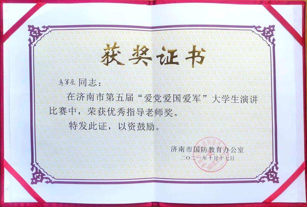 在濟(jì)南市第五屆大學(xué)生“愛黨愛國愛軍”大學(xué)生演講比賽和第五屆國防教育技能競賽賽中,在學(xué)生工作部(處)馬軍臣老師的指導(dǎo)下,我校同學(xué)喜獲佳績。