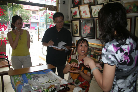 8月22日下午,萊州調(diào)研組采訪了一位萊州制筆廠的90歲退休工人王建義,詳細(xì)地講述了個人從業(yè)經(jīng)歷,以及他制作毛筆的原料和工序等。隨后,調(diào)研組又考察了萊州刺繡,對萊州刺繡的品種、技法、銷售做了大致了解。