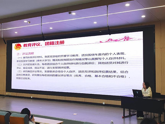 褚丁慶以高校基礎團務解讀為主題,結合自身工作經歷,簡明扼要的點出了團務工作的重點、要點,就青年大學習、教育評議和團籍注冊、五四評優、推優入黨、社會實踐、組織生活會、團支部對標定級等具體工作進行了詳細的講解,全面、準確、深入梳理了共青團工作的基礎團務。她強調,基層團干部是基層團組織建設和工作的重要力量。作為基層團干部,準確把握基礎團務工作是做好基層團組織工作的基礎。希望團干部們在工作中不斷提升業務能力,在保質保量完成基礎團務工作的同時創新性開展團支部活動,提升團支部活力,團結帶領更多青年堅定不移聽黨話、跟黨走,展現新時代新青年的新擔當與新作為。