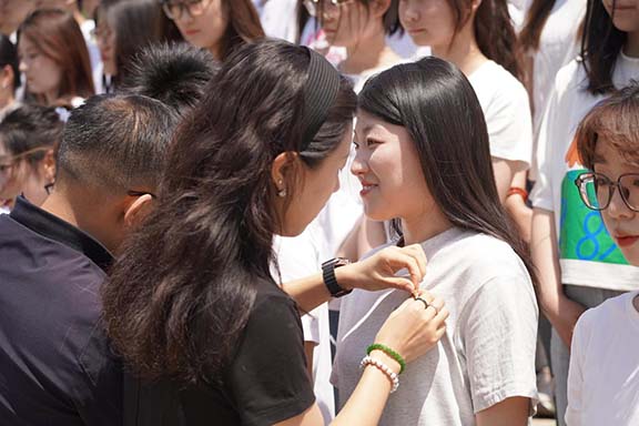 接下來,主持人宣布了新團員名單,各學院團總支書記為新發展團員佩戴了團徽。熠熠生輝的團徽,承載著共青團的光榮與責任,新團員們接過這份榮耀,也接過了時代賦予的使命。