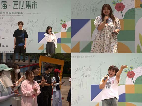 集市現場吸引了大量校園開放周期間來校參觀的嘉賓、校友、家長以及學校師生參與其中。集市攤位涵蓋了服裝設計、文創/造型、產品設計、工藝美術、非遺傳承、傳統書法繪畫以及民藝創新等多個領域,充分展現了學校的專業特色和我校大學生的創新意識。同時多場文藝表演,也為集市增添了歡樂氛圍。
