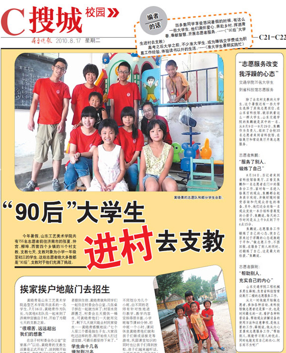 日前,活動的開展受到了媒體的關注與報道,齊魯晚報于8月17日以“'90后'大學生進村去支教”為標題做了整版報道。此前,大眾日報還對我校“讓泉城遠離水患”調研團隊的調研活動進行了報道。