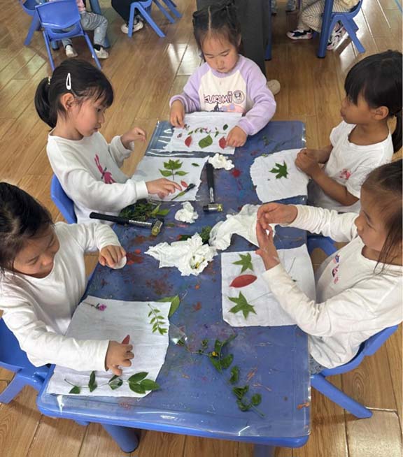 在志愿者的耐心指導下,孩子們手持小錘,小心翼翼地敲打植物,讓植物的汁液一點點滲透到布料中,隨著敲打的進行,原本潔白的布料上逐漸顯現出植物的輪廓與色彩,一幅幅精美的植物拓印作品初具雛形。小朋友們看到自己的勞動成果,臉上洋溢著自豪與喜悅的笑容,他們互相展示自己的作品,興奮地討論著每一片葉子和花瓣的細節,志愿者們也鼓勵孩子們發揮創意,嘗試不同的植物組合,創造出更多獨特的圖案。