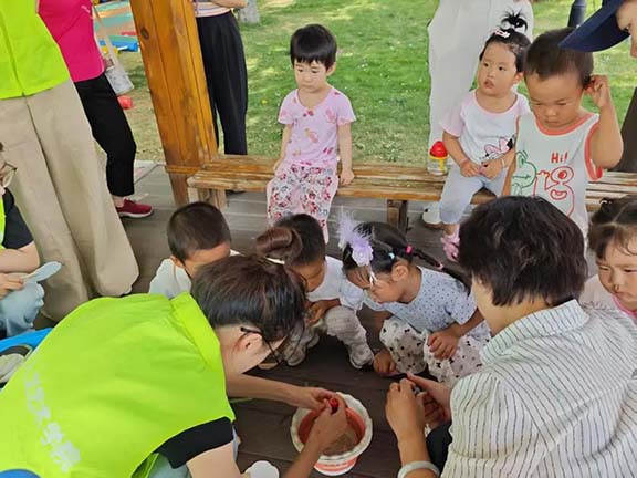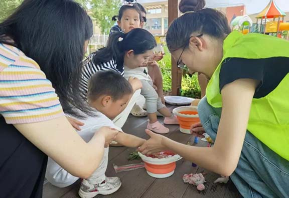 在制作環節中,小朋友們充分發揮自己的創造力,在志愿者們的幫助下將不同顏色的漆料滴入水中,輕輕攪拌,形成獨特的紋理和圖案。接著,他們將白色的扇面緩緩浸入水中,讓漆料自然附在扇面上,形成一幅幅色彩斑斕、獨具匠心的漆扇作品。
